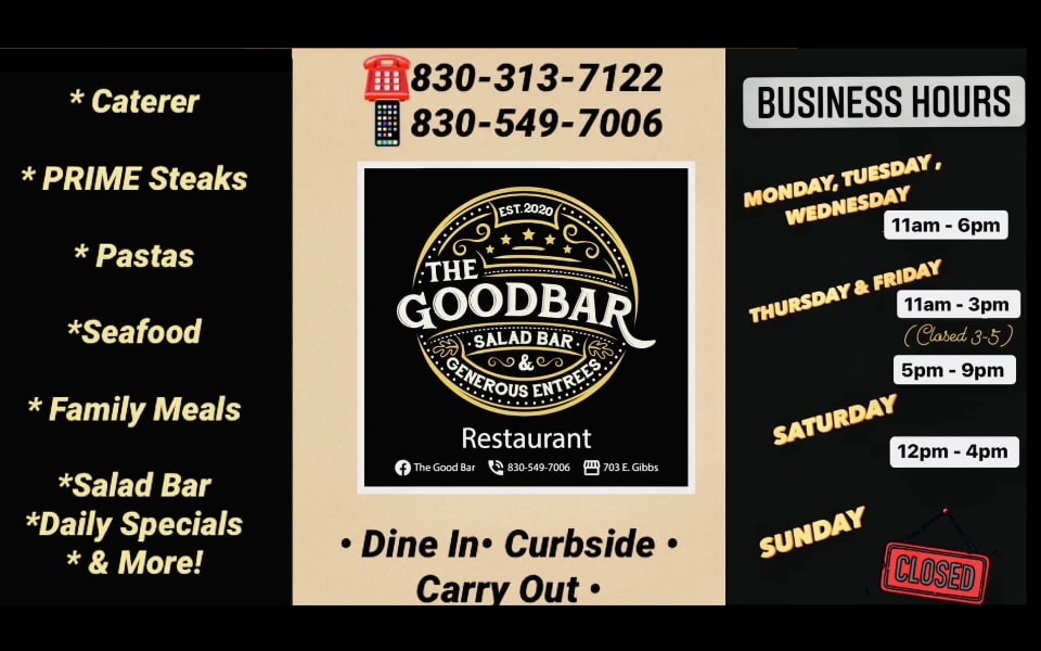 THE GOOD BAR Back to Search THE GOOD BAR Categories Restaurants, Food & Beverage Catering Food & Beverages (830) 549-7006 Send Email Share × Print Email Facebook LinkedIn X Pinterest Powered By GrowthZone